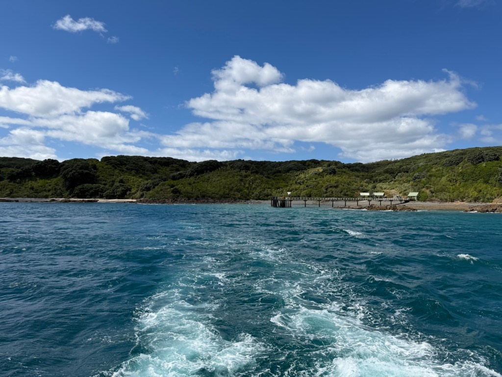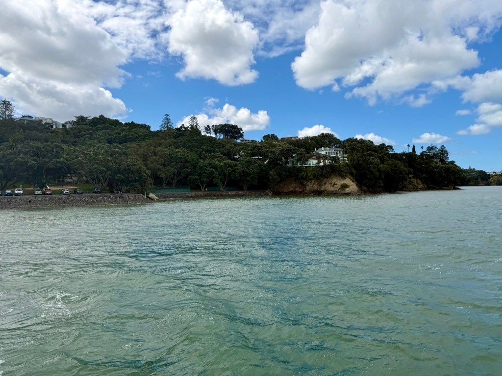 Nachdem die Fähre am Hafen abgelegt hat, geht es nach einem kurzen Stopp im ältesten Stadtteil Aucklands, gemächlich nach Waiheke. Die Insel begrüßt einen mit herrlichem Wetter.