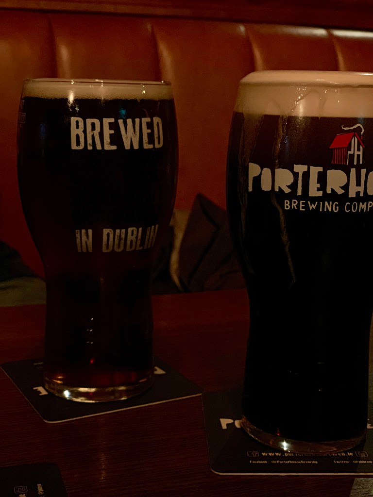 Nach der Ankunft sind wir mit dem Bus in die Stadt gefahren und ich habe – so gut ich konnte – mein Dublin-Wissen zum Besten gegeben. Leider hat es den restlichen Tag geregnet, sodass wir uns in Geschäften und kleinen Läden aufgehalten haben. Gegen Abend hatte ich dann endlich das ‚Porterhouse‘ wiedergefunden und dort haben wir zu Abend gegessen. Es gab einen Burger und für mich ‚Seafood Chowder‘. Da hatte ich schon den ganzen Tag Lust drauf. Kredenzt mit einem Stout, dass so bitter war, dass ich es nicht austrinken konnte. Bäh. Da bleibt man doch besser beim Dingle-Gin. Als Absacker haben wir uns mit einem Cider eingedeckt, denn eine Folge von ‚The Horn‘ war noch offen. Also haben wir uns gemütlich aufs Bett gesetzt und haben diese Reise-Tradition beendet.