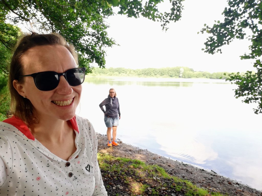 Veranschlagt war der Weg um den Muggesfelder See mit etwa 1,5 Stunden. Sabrina gehört zu den schnellsten Gehern, die ich kenne, also dachte ich mir schon, dass wir das in etwa einer Stunde schaffen. Dann kam es doch anders, als wir dachten, obwohl wir trotzdem in einer Stunde wieder am Auto waren. Wir beschließen einstimmig unsere Rucksäcke im Auto zu lassen. Nur mit dem Smartphone bewaffnet ziehen wir los.