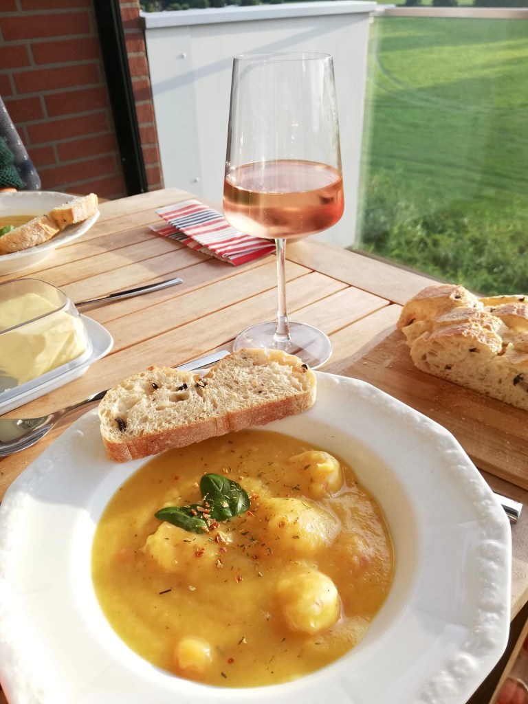 Zum Abendessen haben wir ein Gemüse-Wurzel-Süppchen mit Garnelen an Oliven-Focaccia mit einem Hauch von Zimt verspeist.
