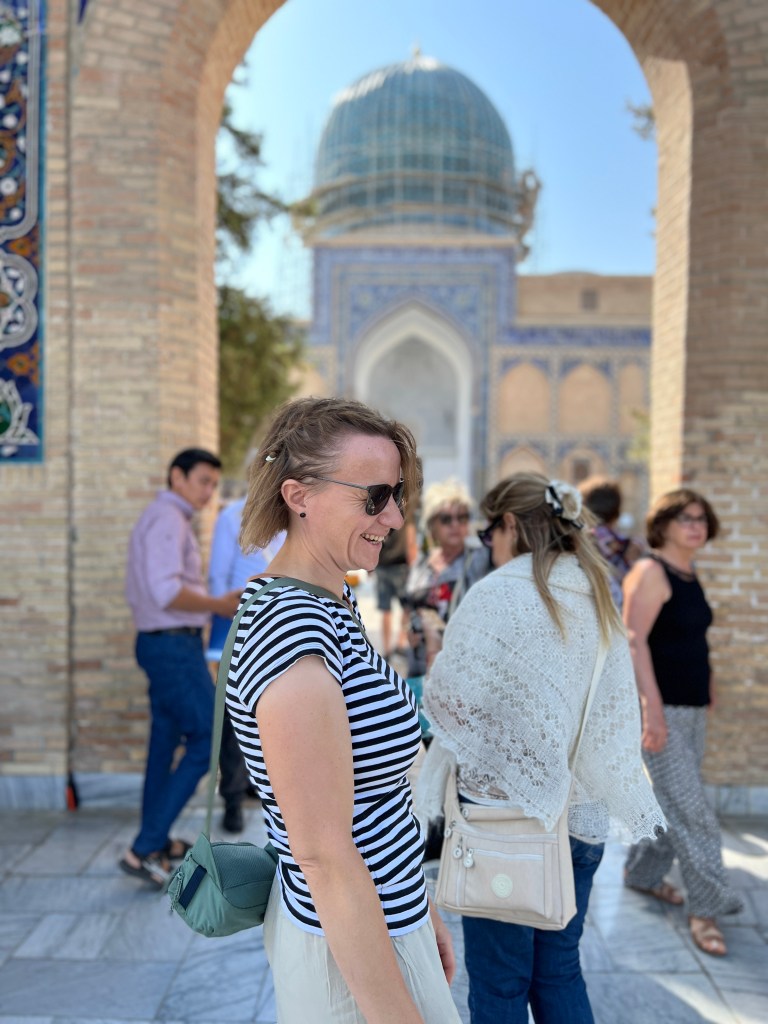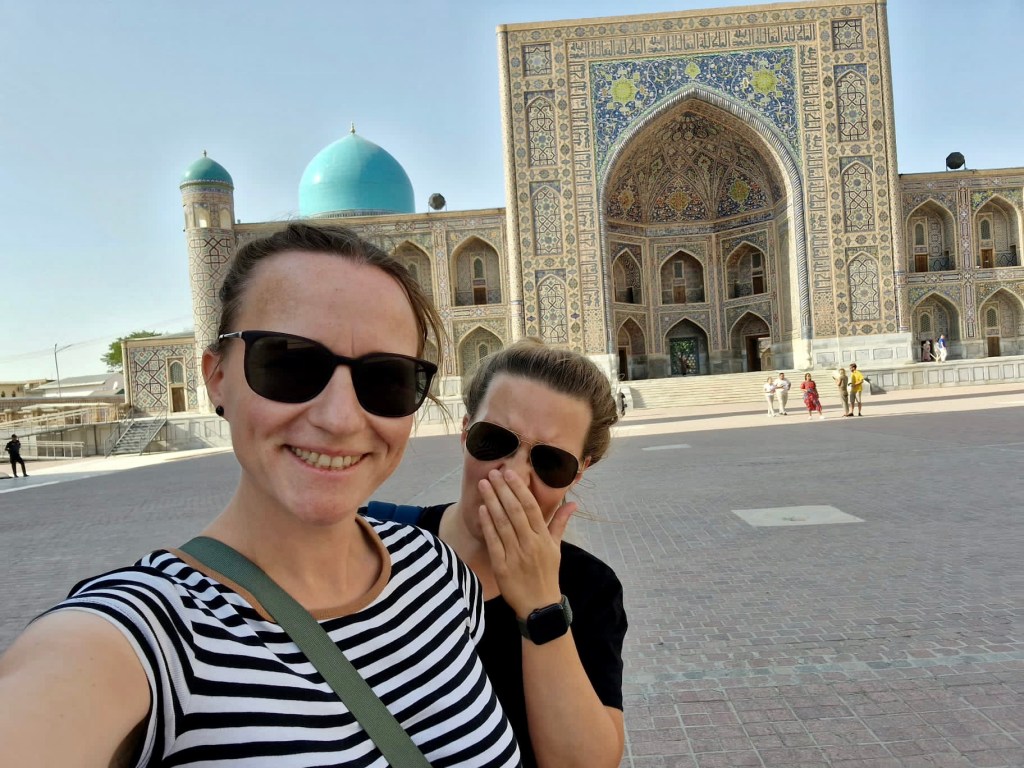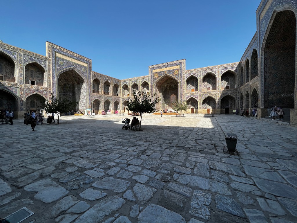 Auf dem Weg zurück nach Samarkand äußern wir den Wunsch, dass wir gerne noch ein wenig bummeln wollen und versuchen so subtil wie möglich durchklingen zu lassen, dass wir alleine klar kommen. Das klappte am Ende, sodass wir tatsächlich durch Souvenirläden streifen konnten. Natürlich haben wir in einem Café eine Runde die Füße hochgelegt. Für den kleinen Snack zwischendurch gab es Baklava und Möhrensalat. Es ist herrlich einfach nur Leute zu beobachten. Teilweise kennt man sich, denn unser Reiseplan deckt sich mit dem Reiseplan von anderen Gästen. Am Registan-Platz sitzen wir auf einer Bank und beobachten die vielen Hochzeitspaare, die mit Ihrer Entourage und Fotograf im Schlepptau Fotos schießen. Im Hotel angekommen, sortieren wir schon mal unsere Koffer vor und hängen ein bisschen rum, bis wir wieder zum Abendessen abgeholt werden.