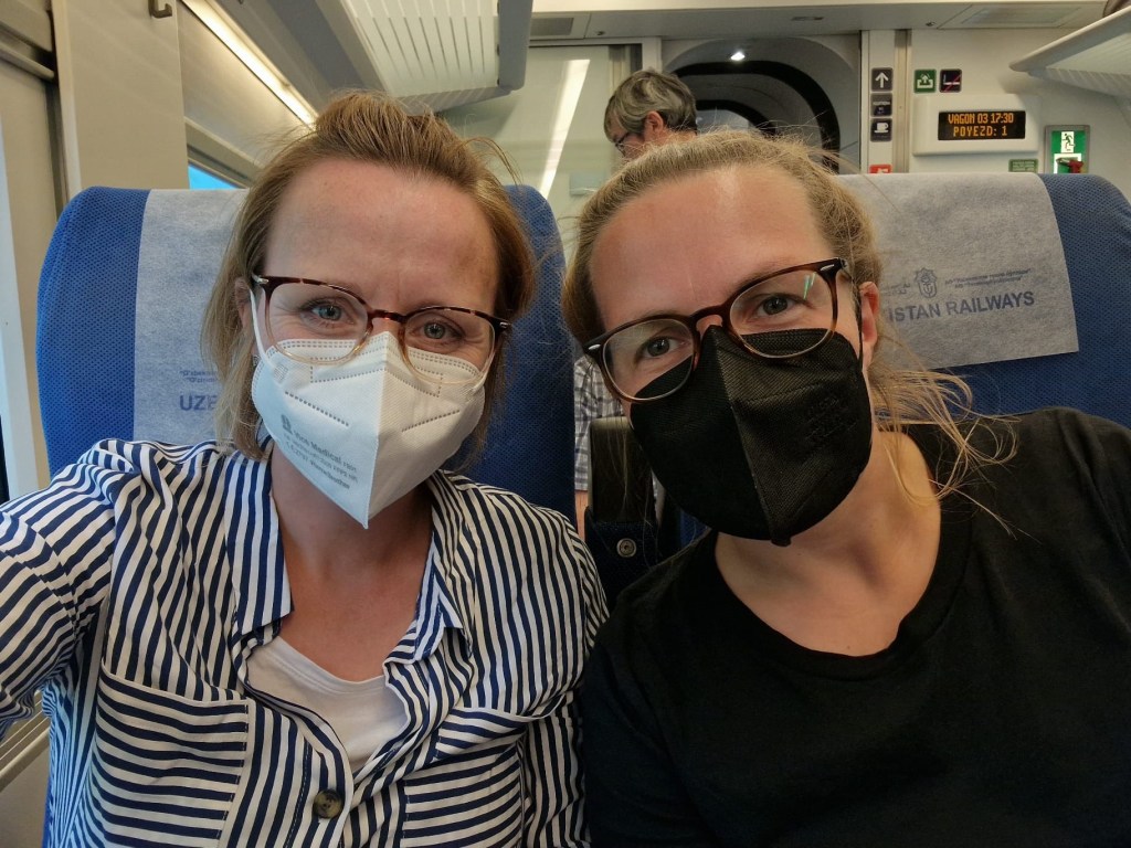 Im Zug von Samarkand nach Tashkent tragen die Zugbegleiter ebenfalls Maske.