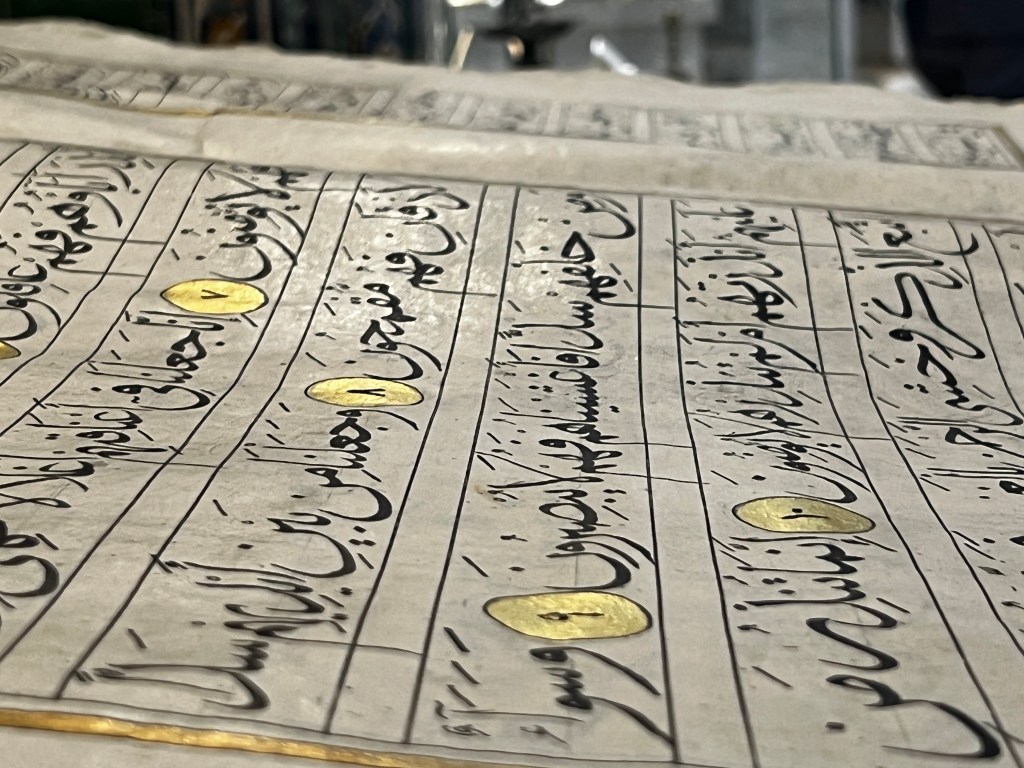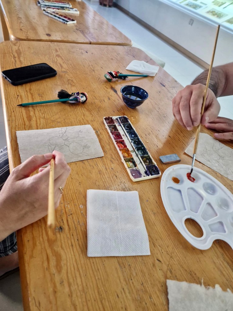 Nach dem Mittagessen besuchen wir eine Kalligrafiewerkstatt, wo wir eine kleine Überraschung erleben. Wir lassen uns, nicht wie sonst, komplett berieseln. Nein – wir sollen malen. Das wird interessant… Wir sitzen mit dem Sohn einer der bekanntesten und traditionsreichsten Kalligrafen aus Usbekistan zusammen an der Palette und sollen Granatäpfel malen. Das hat erstaunlicherweise Spaß gemacht. Während wir den Anweisungen den Meisters folgen und lauschen, bekommen wir wieder Tee und Obst gereicht.