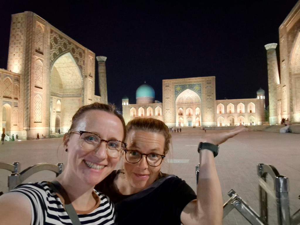Zum Abendessen werden wir in einer usbekischen Familie irgendwo in einer Seitenstraße in Samarkand erwartet. Neuerdings fragen wir fast jedes Mal, wenn wir wohin wollen, nach dem Weg. So langsam kann man zu der Erkenntnis gelangen, dass das normal ist. Wie üblich sieht das Haus sehr unscheinbar und nichts-sagend von außen aus. Ein Blick in den Innenhof und schon finden wir uns mitten im Familienleben wieder. Die Zutaten fürs Plow stehen bereit und wir bekommen die Zubereitung erklärt. Direkt dahinter befindet sich ein Lehmofen aus dem die Flammen lecken. Neben Plow gibt es usbekisches Brot und Somsas. Beim Schneiden der Möhren fürs Plow sollen wir helfen. Sabrina macht den Paparazzi und ich schneide die Möhren und ernte dafür Applaus. Das finde ich witzig. In Usbekistan werden die Teigwaren wie Brot und Somsas im Lehmofen an der Wand gebacken. Ich werde gefragt, ob ich da mitmachen will. In einen glutheißen Ofen greifen? Darum muss man mich nicht zwei Mal bitten. Ehe ich mich versehe trage ich einen usbekischen Mantel zum Schutz. Bevor ich aber Brot an die Wand werfe, werden wir beim Somsas-falten eingebunden. Wie üblich bin ich erstmal begriffsstutzig und brauche zwei Anläufe, bis ich verstehe, wie das geht. Dann habe ich den Dreh raus und mir wird ein zweites Mal applaudiert. Der Ofen ist backbereit und ich schmeiße ein Brot an die Wand. Zum Glück hält es. 😅 Gleiches gilt für eine Somsa (gefüllte Teigtasche). Zwischendurch wird der Plow weiter bearbeitet. Es kommt Reis dazu und dann wird weiter gekocht. Das dauert etwa 1 – 1,5 Stunden. Gegessen wird im Gastraum, der uns die Sprache verschlägt. Der Tisch ist bereits mit Essen übersäht. Dabei sind die Teigtaschen und das Plow noch nicht mitgezählt. Wir probieren beide tapfer alles durch, sind allerdings nach den Probierportionen satt. Wir essen einfach weiter, weiter und weiter. Wohlwissend, dass die Mengen keine gute Idee sind… Meine Nase ist leider so zu, dass ich von all den Köstlichkeiten kaum was schmecke. Außer dem Sauerquark. Der ist ziemlich intensiv. Wir sind wieder im Hotel angekommen und haben uns ins Bett gerollt.