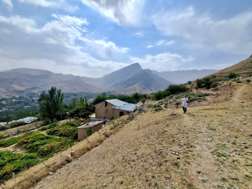 Sabrina und ich sind irgendwie nicht so sehr an dem Park und der Quelle interessiert. Vielmehr sind wir vom Bergpanorama fasziniert. Als unser Reiseleiter fragt, ob wir zwei Birkenstocktanten nicht ein bisschen den Hügel raufgehen wollen, ist die Antwort klar. Hinter dem Komplex befindet sich ein Friedhof und dahinter Häuser, die sich an den Hang schmiegen. Wo ein Teil des echten usbekischen Lebens stattfindet. Wir gehen immer weiter den Hügel hinauf und laufen durch eine Gasse. Unser Reiseleiter spricht mit jedem und fragt, ob es weiter hoch geht und ob man durch den Garten gehen darf. Erwartungsgemäß ist das natürlich kein Problem. Gerade für die Kinder sind wir DIE Attraktion schlechthin. Beide blond, mit Smartphones in der Hand und Sonnenbrille auf der Nase. Wir überlegen, ob wir vielleicht für einige Kinder die erste Begegnung mit Touristen sind. Leider haben wir nichts mitgebracht, was wir hätten verschenken können. Keine Bonbons oder andere Süßigkeiten.