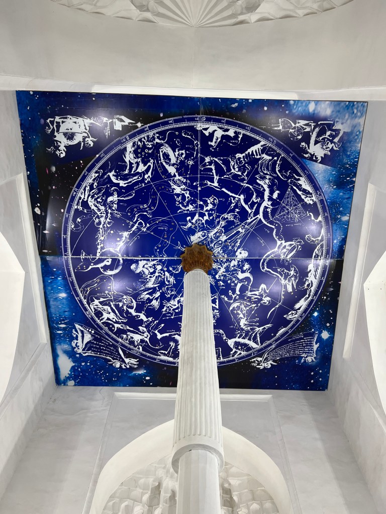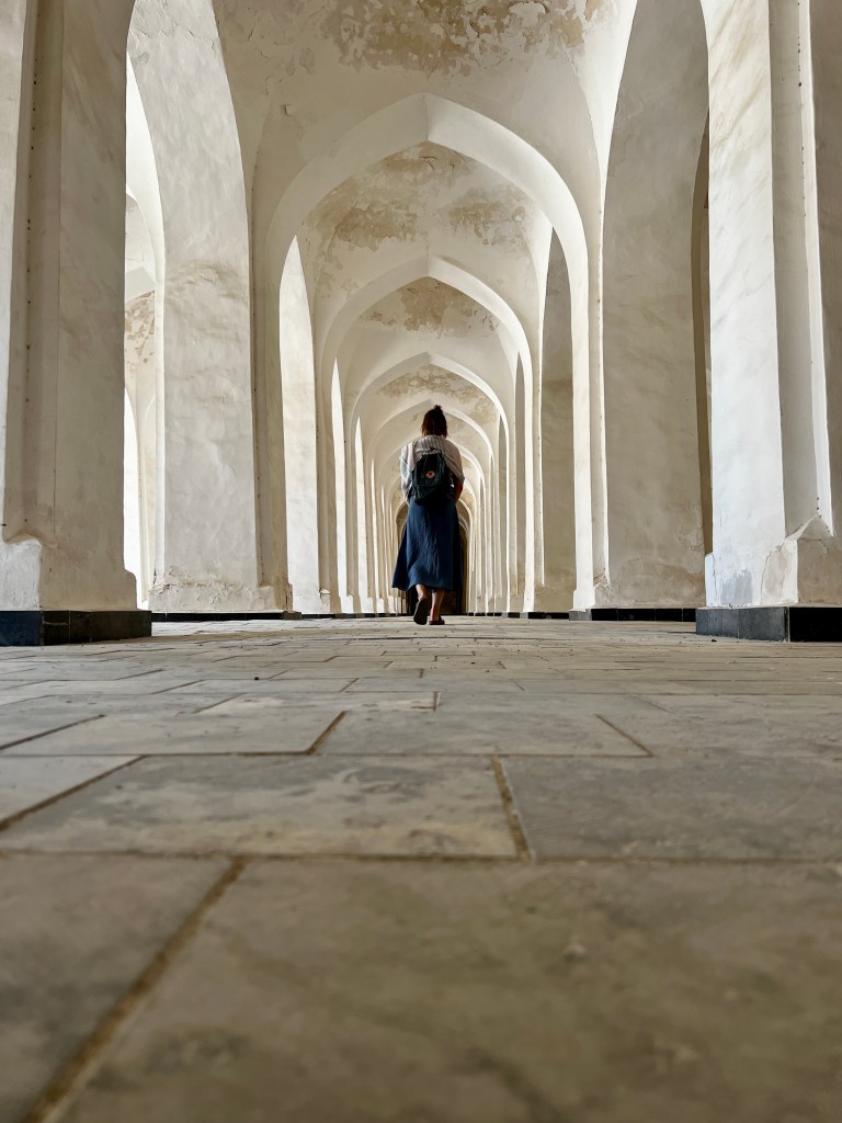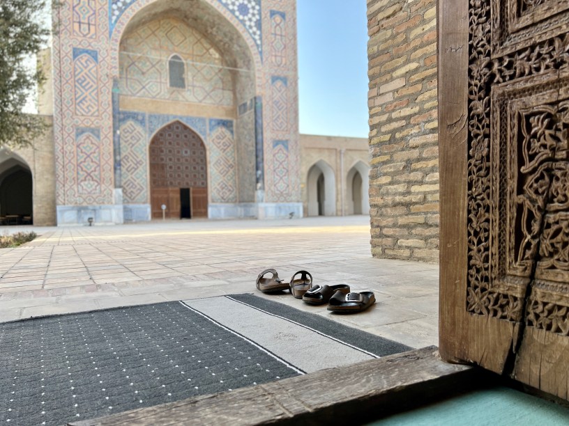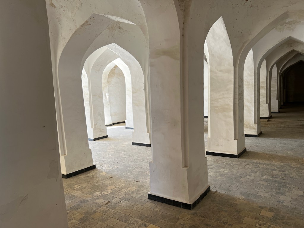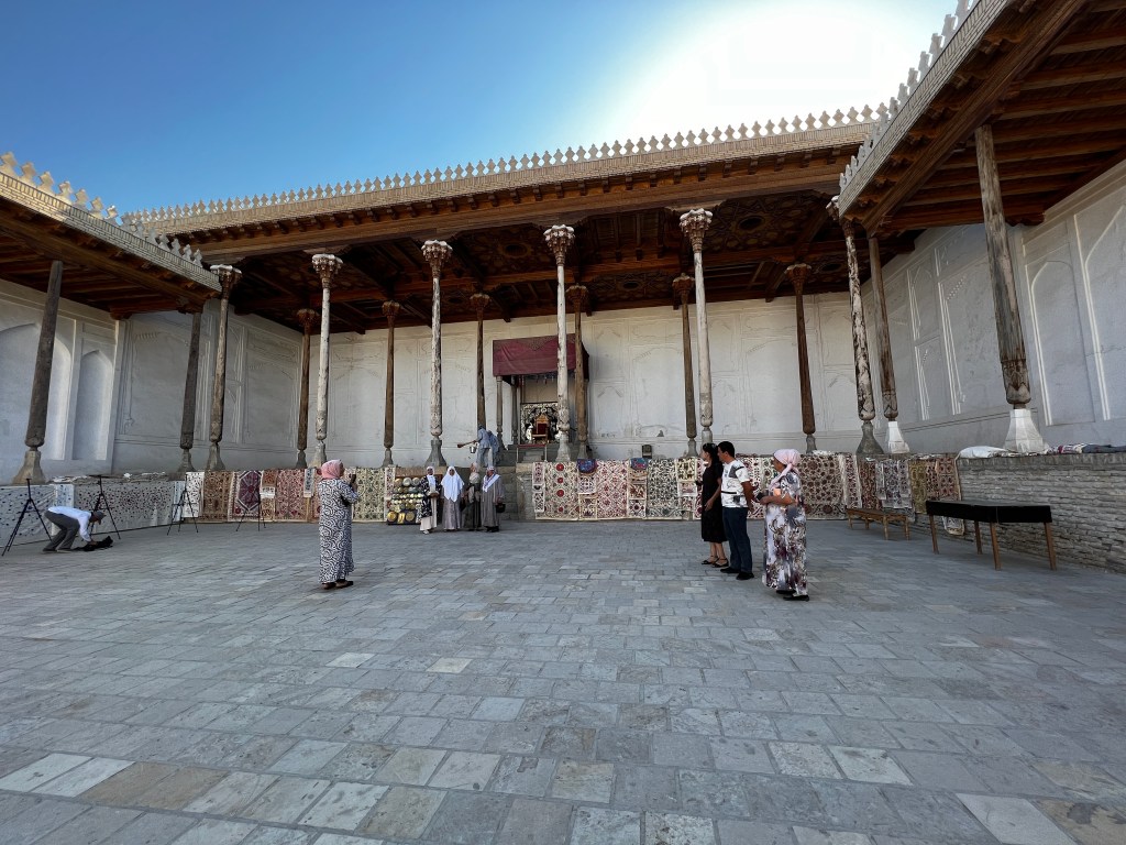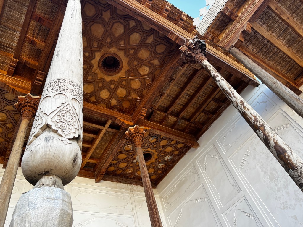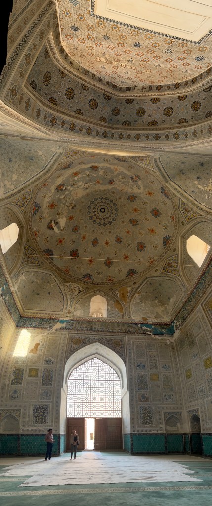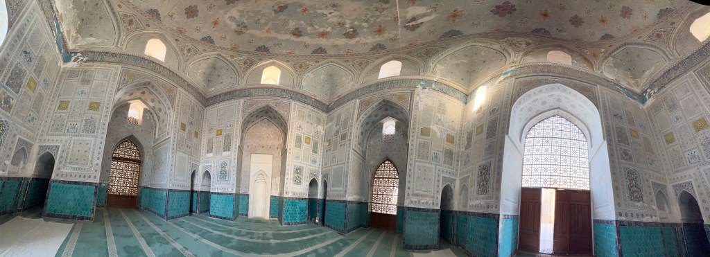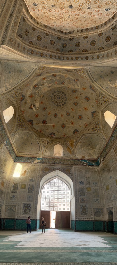 Wie gehen ein paar Straßen weiter und kommen zur tausendjährigen Moschee. In der Nähe steht ein Minarett von 47 Metern Höhe und 81 Stufen. Das ist bisschen schief, weil das Erdbeben aus 1966 (#tashkent) nachgeholfen hat. In der beeindruckenden Moschee angekommen, hören wir die Geschichte über einen arabischen Reisenden namens al Masri. Der kam auf seinen Reisen hier vorbei und erwähnte diesen Ort in seinem Reisetagebuch. Jedoch ohne Angabe wie viele Säulen – es gibt insgesamt 213 Säulen – er sah. Mittendrin steht ein kleines kuppelförmiges Häuschen. Das ist eine Art Geschenkplatz. Da ließen reiche Leute mitgebrachtes Essen, welches arme Leute wiederum mitnehmen konnten. In dieser Moschee haben bis zu 3.000 Menschen Platz.