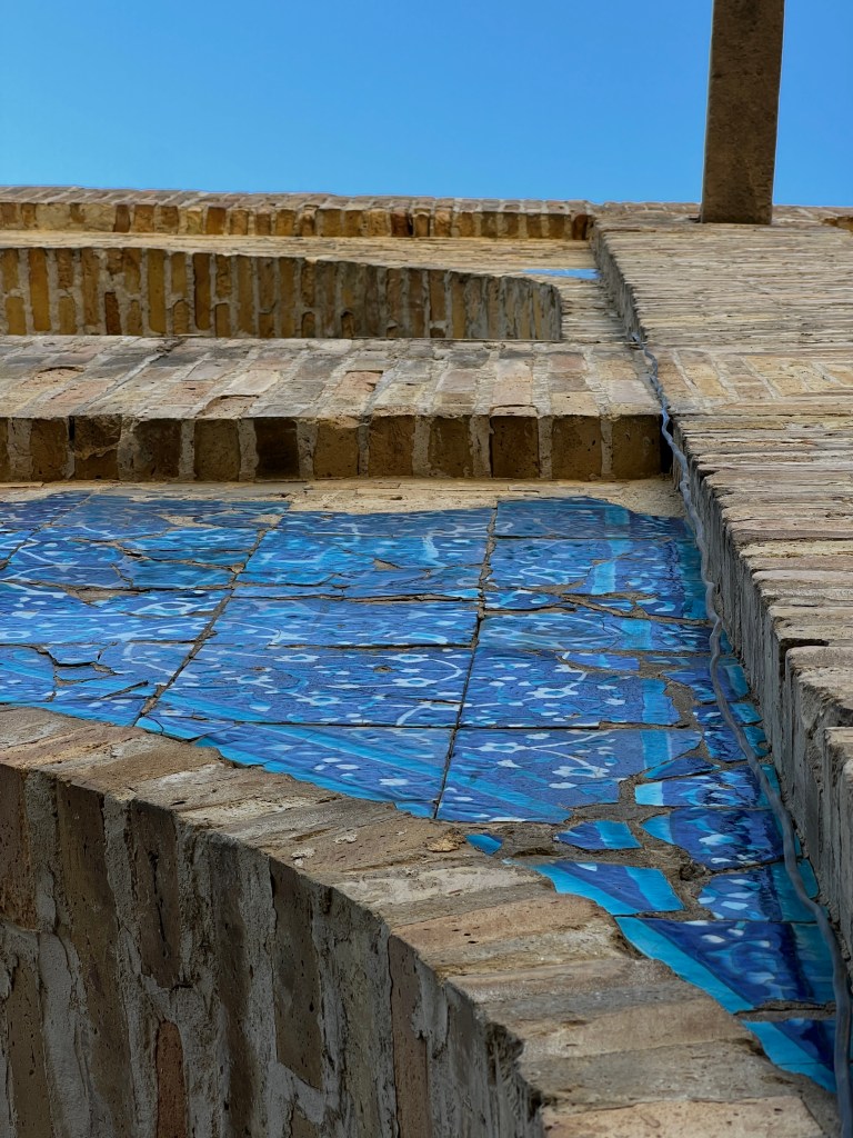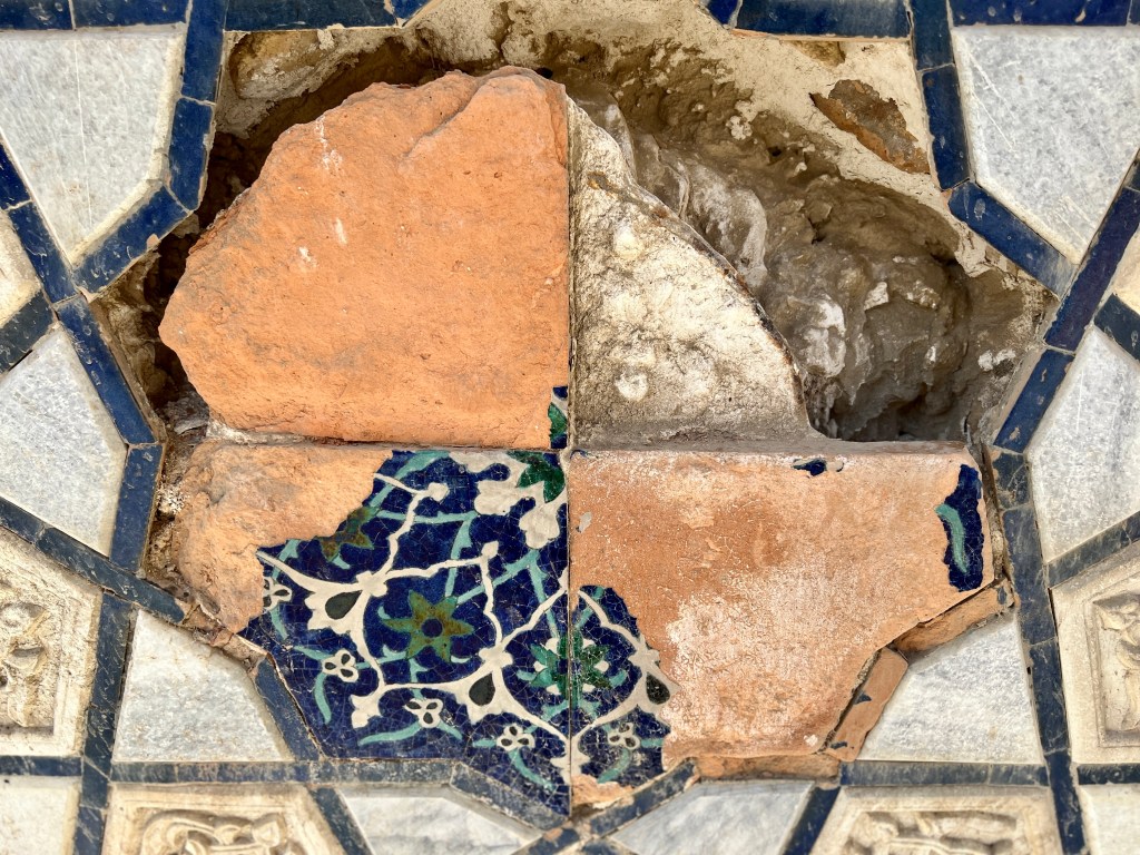 Wir arbeiten uns tiefer in den Palastkomplex vor und treten nach einem Durchgang hinaus in einen weiteren Innenhof, in dem sich die Sommermoschee befindet. Ein unglaublicher Anblick in blau. Auf den Kacheln finden sich arabische Buchstaben in persischer Sprache. Das Design der geometrische Figuren und floralen Mustern in den Farben, weiß, blau und türkis sollte die Nerven beruhigen. Die vielen Fliesen wurden neben Gips mit 12 cm Nägeln befestigt. Beim Brennen der Fliesen wurde dafür bereits ein Loch in der Mitte berücksichtigt, da diese sonst kaputt gehen würden, wenn man versucht einen Nagel einzuschlagen.