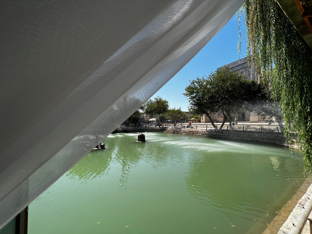 Unmittelbar vor dem Mittagessen schauen wir uns ein weiteres Eingangstor der Medrese Nodir Devon Begi an, die keine eigene Moschee aufweist. Wir nehmen in einem sehr schönen Restaurant unser Mittagessen ein. Dieses liegt direkt an einem Wasserbecken Labi Hovuz.