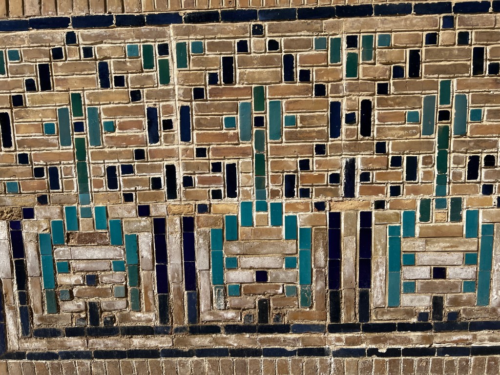 Eine Palastanlage, die Ihres gleichen sucht. Man nennt ihn auch den Steinpalast, oder den Labyrinth-Palast. Wir finden schnell heraus, dass Labyrinth es gut trifft. Steinpalast deswegen, weil für den Bau des Palastes die umliegenden Steine verwendet wurden. Es gibt 3 Eintrittstore und ein extra Gästehaus in blau, mit überwiegend Originalfliesen. Hier konnten 4 Gäste empfangen werden. Die Dicke der Wände kann bis zu einem Meter sein – daher ist es schon kühl. Interessanterweise oder besser gesagt, unglaublicherweise stammen alle Fliesen von einem! Handwerker namens Abdullah. Deswegen erhielt er den Beinamen Djin, denn dass er alle Fliesen alleine hergestellt hatte, konnte nicht mit rechten Dingen zugehen. Der Palast hat 163 Räume. Wir treten in einen weiteren kleinen Innenhof. Unser Khan von Xiva (= unser zusätzlicher Guide) hat dort nämlich einen Maulbeerbaum gepflanzt, welcher die Feuchtigkeit aus den Wänden ziehen soll. Er nennt den Baum liebevoll die Verliebten, weil die Wurzeln eng umschlungen sind. Spätestens da war für uns wirklich klar, dass wir mit el Jeffe aus Xiva auf Tour sind. Es gibt ein paar Abflüsse in den Höfen, die in eine Art Kanalisation führen. Aber richtig wissen, tut es niemand.