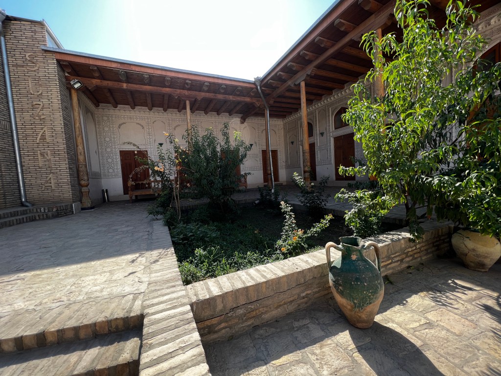 Neue Stadt, neuer Fahrer. Ich habe meinen Lieblingsfahrer und jeder neue Fahrer muss sich daran messen lassen. Der Neue fällt gleich durch, obwohl er noch nicht losgefahren ist. Nachdem Sabrina, Bob und ich auf der Rückbank Platz genommen haben, merken wir schnell, dass in diesem Chevrolet geraucht wurde. Klischeehaft hängt ein Duftbaum im Auto. Nun gut, wir haben in Usbekistan gelernt uns nicht von Äußerlichkeiten blenden zu lassen. Fahren ist wichtiger als der Geruch im Auto, denn schließlich soll er uns bis Samarkand begleiten. Der erste Stopp wäre das Restaurant fürs Mittagessen. Zunächst fährt er unauffällig und wir denken schon, er gehört in die Kategorie neutraler Fahrer. Fährt gut, ohne Besonderheiten. Bis sein Google Maps Ihn im Stich lässt. Dann wird es richtig interessant. Bisher auch der erste Fahrer, der überhaupt mit Navi fährt. Als Usbekistan-Expertinnen sehen wir das natürlich gleich schon am Nummernschild, denn die erste Zahl gibt an, aus welcher Region der Fahrer kommt. Unser Fahrer ist eindeutig nicht aus Buchara. Wir suchen wohlgemerkt ein Restaurant. Wir drehen diverse Male um und fahren ein Stück zurück. Dann fahren wir in eine Einbahnstraße, weil Google Maps sagt, dass da der richtige Weg ist. Vor uns fährt auch ein Auto gegen die Einbahn. Was soll’s. Merklich werden die Straßen enger und enger und enger, sodass man sich zurecht Fragen darf, wie da überhaupt ein Auto durchpassen soll. Unser Fahrer verzieht keine Miene und bleibt bei 42 Grad Außentemperatur cool und manövriert seinen Chevrolet sicher durch die engen Gassen. Manchmal hätte nur ein Blatt zwischen uns und die Hauswände gepasst. Nachdem wir uns aus dem Labyrinth rausgekämpft haben, stellt sich heraus, dass wir falsch sind. Zum ersten Mal wird nach dem Weg gefragt. Also wieder zurück durch die engen Gassen. Wir werden noch vier weitere Male anhalten, um nach dem Weg zu fragen. Statt 15:00 Uhr erreichen wir erst 45 Minuten später das Restaurant. Mir läuft und läuft der Schweiß einfach nur so runter und Hunger hab ich auch nicht. Es ist erstaunlich wie der Körper schwitzt, wenn man noch eine Kanne heißen Tee hinterher schüttet. Irgendwann brechen wir Richtung Hotel auf, was sich ein bisschen einfacher gestaltet. Unsere neue Bleibe liegt wieder mitten in der Altstadt und bisher reicht Buchara noch nicht an Xiva ran, was sicherlich bald ändern wird.
