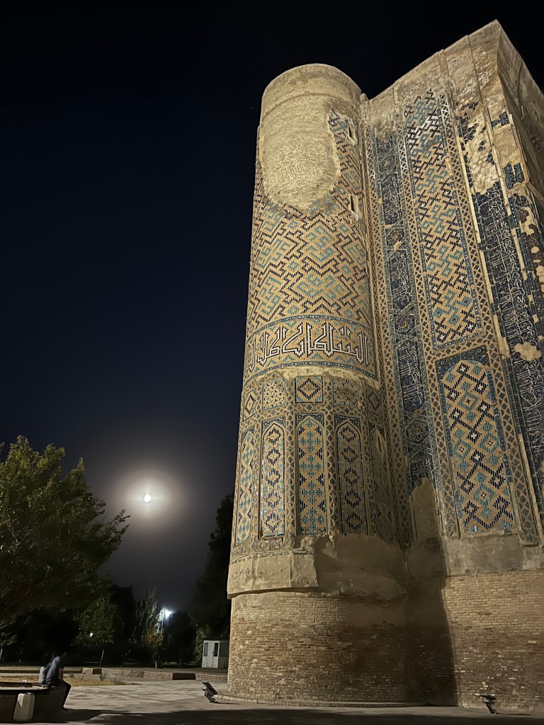 Ist ein unfertiges Minarett, welches trotzdem stolze 29 Meter hoch ist und einen Durchmesser von 14,2 Metern aufweist. Der damalige Khan ist beim Bau gestorben. In solchen Fällen ist es untersagt ein Gebäude, was der Verstorbene begonnen hat, zu vollenden. Das lässt man dann lässt halt so. Es gibt verschiedene Theorien wie hoch das Minarett mal hätte werden sollen. Es wurde errechnet, dass bei 14,2 Metern Durchmesser eine maximale Bauhöhe von 140 Metern hätte rauskommen können. 29 Meter sind schon beeindruckend.