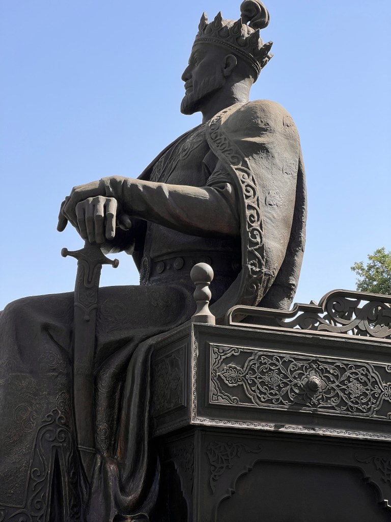 Weiter geht es hinter dem Registan Platz vorbei in Richtung Amir Timur Denkmal. Dabei stoppen wir erneut am Grabmal von Amir. Dieses Mal gibt es dort keine Baugerüste. Das Amir Denkmal können wir nicht so richtig gut fotografieren, weil die Sonne unpassend am Firmament steht. Bevor wir zum letzten Programmpunkt aufbrechen, werfen wir einen Blick in eine orthodoxe Kirche.