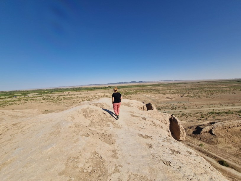 Heute standen zwei archäologische Ausgrabungsstätten auf dem Plan und ein Mittagessen in einer Jurte. Klingt irgendwie nach Abenteuer. Allein schon die Straßenverhältnisse lassen sich als solches beschreiben. Man liest verschiedentlich in Reiseführern, dass die Straßenverhältnisse zu wünschen über lassen. Jau- dem würde ich mehr als zustimmen. Deswegen fährt der Usbeke aber keinen Allradwagen. Ein weißer Chevrolet tut es auch. Dieses weiße Schlachtross bringt uns über einen Weg, der ein Flickenteppich aus Straße ist, raus aus Urganch mit Ziel Tuproq Qual‘A. Auf dem Weg dorthin fahren wir in die Provinz Karakalpakstan. Genauer gesagt nach Südkarakalpakstan. Bei diesen Namen denke ich nun wiederum nicht an Herr-der-Ringe, sondern an Star Wars. Karakalpakstan könnte irgend so ein abgelegener Planet im Outer Rim sein. Dies ist die erste Ruine, die wir uns anschauen, die bereits aus der Ferne zu erkennen ist. Nicht zum ersten Mal denke ich an Marokko in diesem Urlaub. Diese Perser haben eben überall auf der Welt Ihre Spuren hinterlassen. Außer uns ist weit und breit niemand zu sehen und wir befinden uns mitten in der Pampa. Vor ein paar Treppenstufen halten wir an und beginnen mit dem kleinen Aufstieg. Da bin ich noch mutig ohne Kopfbedeckung unterwegs. Die Hitze ist mir wohl schon im Auto zu Kopf gestiegen… Die Treppenstufen nehmen irgendwie doch kein Ende und bei knappen 40 Grad komme ich recht schnell aus der Puste. Oben angekommen hat man eine herrliche Weitsicht. Kein Wunder, dass eine solche Anlange, an solch einem Platz gebaut wurde. Unser exklusives Erlebnis währte nur kurz, denn dann hat ein Kleinbus Touristen ausgekippt. Wir mit unserem Privatreiseleiter haben uns eben schon daran gewöhnt. Davon abgesehen gibt es in Usbekistan zwar Touristen, aber wir sind größtenteils immer der gleichen Gruppe begegnet. Das ist jammern auf sowas von hohem Niveau. Jedenfalls hatte diese Siedlung im 1. Jahrhundert etwa 2.500 Einwohner. Die Dimension kommt auf den Fotos, wie üblich, nicht so ganz rüber. Der damalige Herrscher hat sich eine ganz passable Hütte mit über 100 Räumen eingerichtet. Das Foto im Reiseführer unterscheidet sich deutlich vom heutigen Aussehen, denn der Wind, der auf diesem Hügel herrscht und die Erosion haben einen Großteil bereits abgetragen. Der starke Wind täuscht über die Hitze hinweg. Zurück im Auto stellen wir fest, dass eine Kopfbedeckung beim nächsten Stop wichtig ist. Sabrina fragt, ob ich mich denn überhaupt eingecremt hätte…